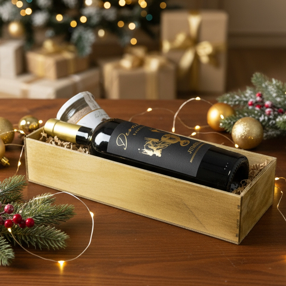 • Caja de madera con viruta decorativa y empaque navideño